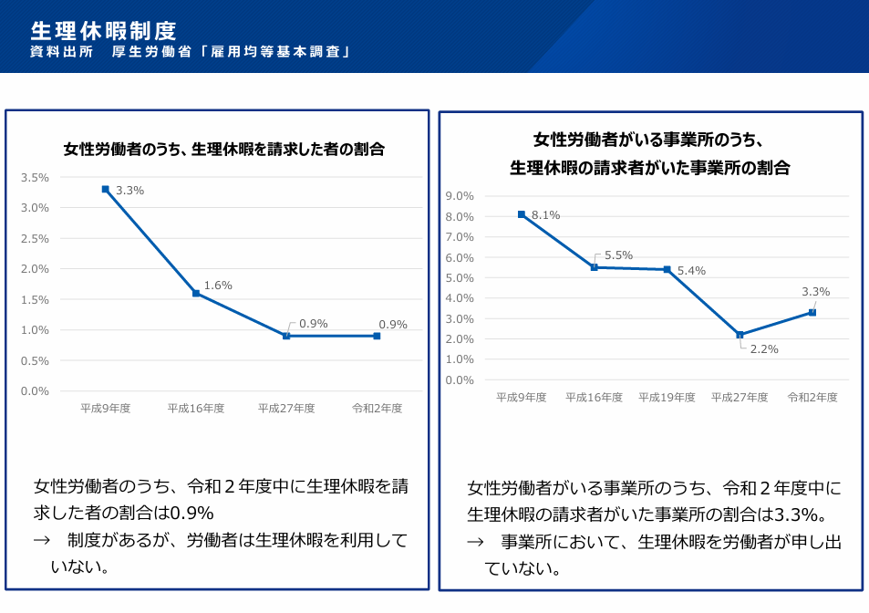 厚生労働省の「雇用均等基本調査」によると、女性労働者のうち、生理休暇を請求した人の割合は、1997年の3.3%から2020年には0.9%にまで減少しているなど、制度が十分に活用されているとは到底言えない状況にあります。