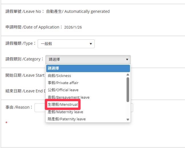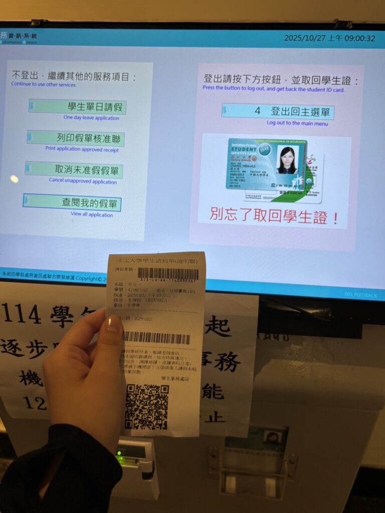 まず、私が台湾における生理事情に関心を持ったのは、大学が認定する「生理休暇申請」の存在を知ったことがきっかけです。私の通っている淡江大学では、女子生徒が毎月生理休暇を取得することができるシステムがあります。取得方法は非常に簡単で、生理に関する体調不良によって欠席を希望する日付をWeb上で申請し、指定の機械で証明書を印刷、該当する授業の担当教員に渡すというものです。このようなシンプルな申請によって、欠席が公欠扱いとなります。ちなみに、生理休暇のほかにも育児休暇や流産休暇なども学生の権利として明記されています。